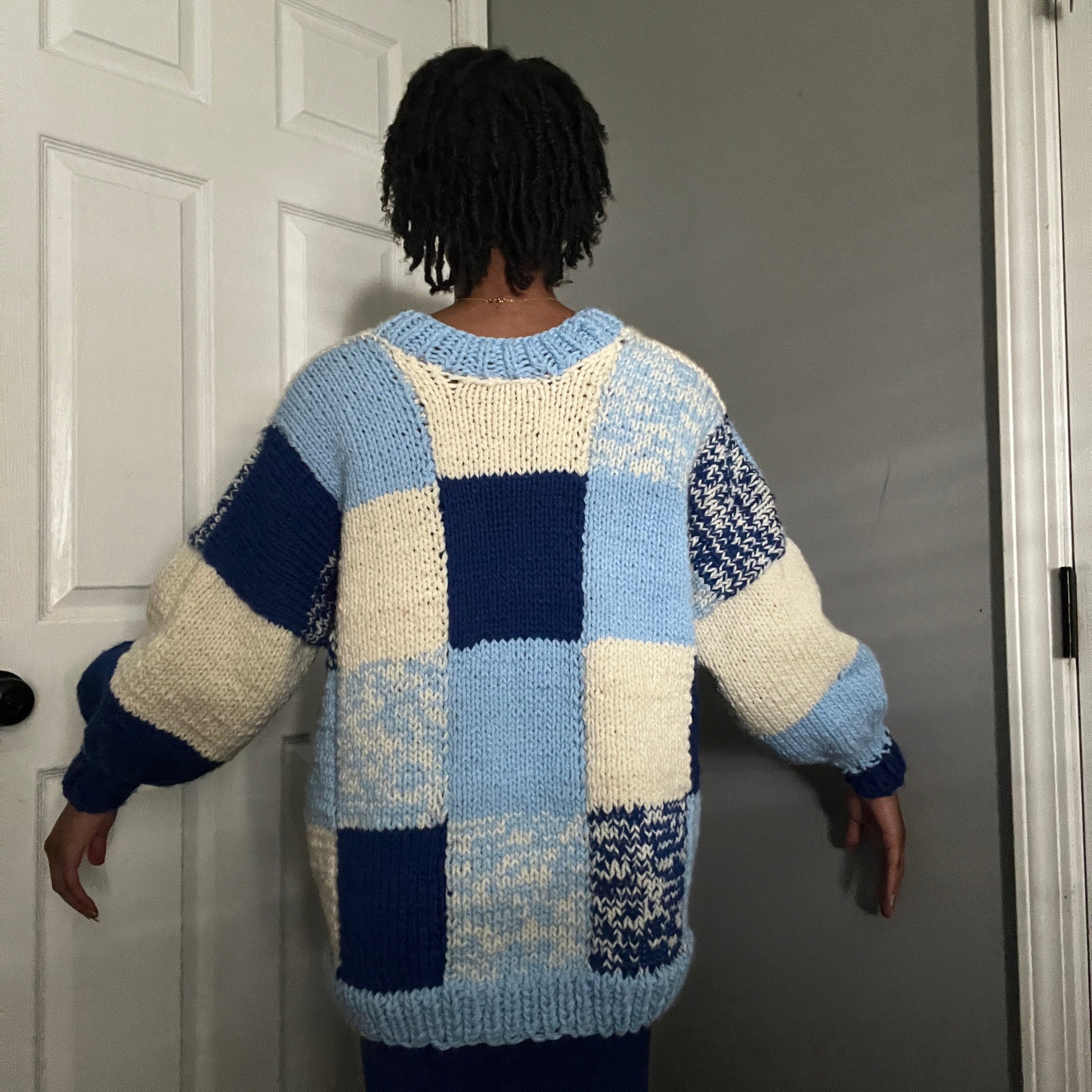 Stay warm and stylish in this chunky knit oversized sweater, designed with a unique patchwork color block pattern in shades of navy blue, light blue, cream, and ivory. Each square is hand-knitted, giving the sweater a one-of-a-kind, cozy, and vintage-inspired look. Perfect for layering in fall and winter, this slouchy handmade pullover pairs effortlessly with jeans, skirts, or leggings.