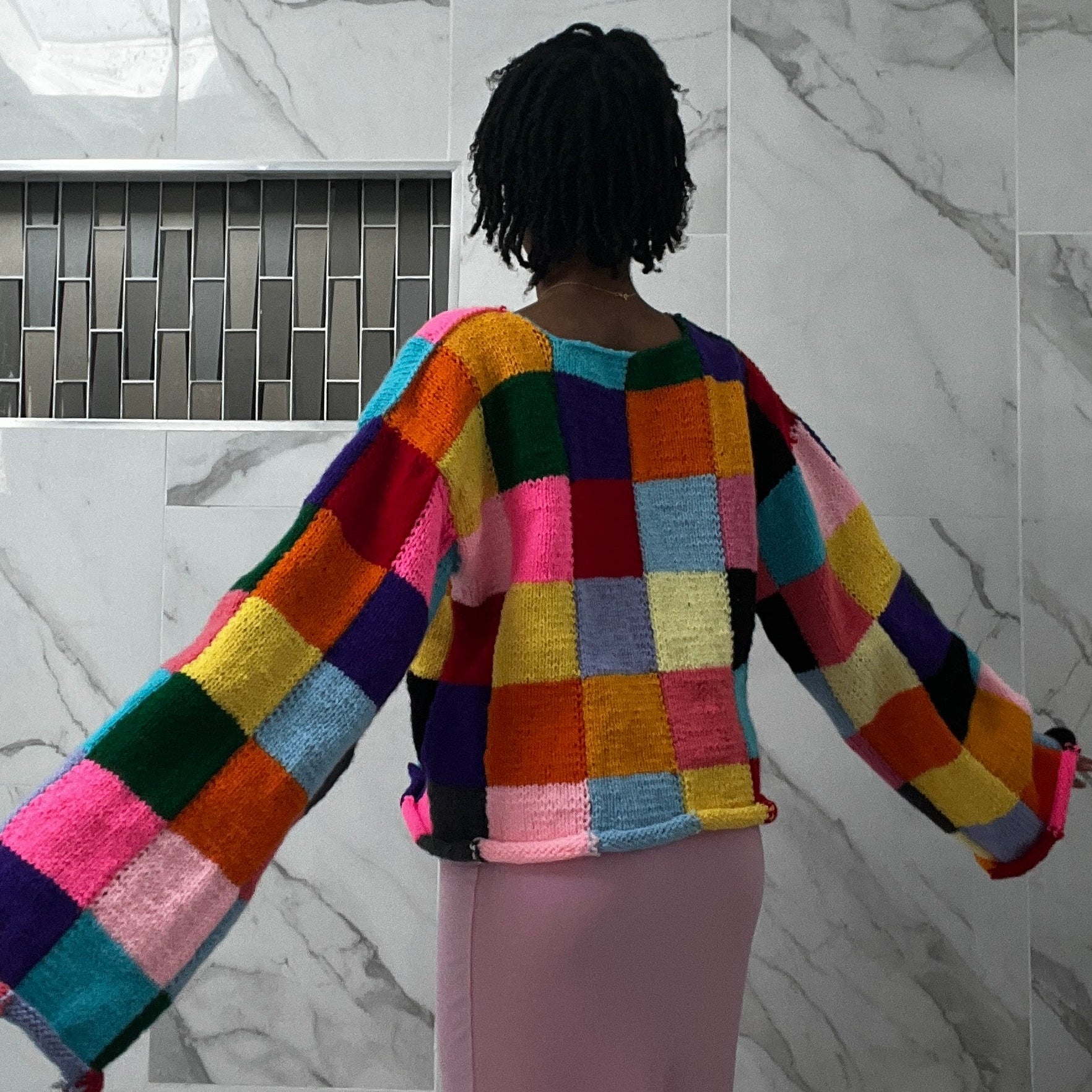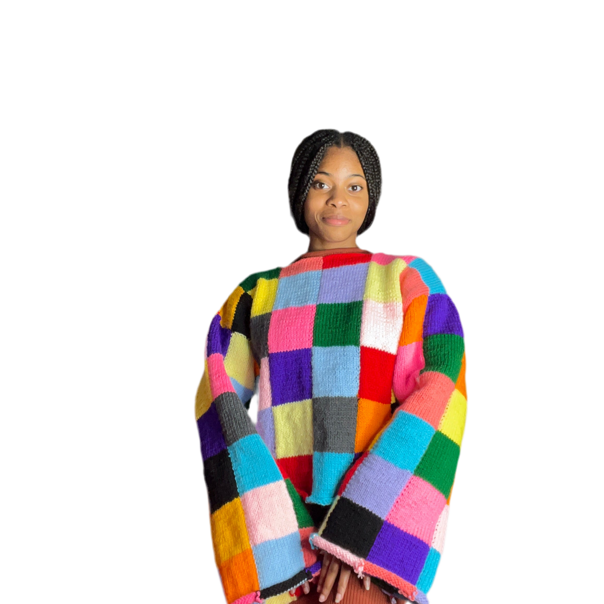 Turn heads in this handmade colorful patchwork knit sweater, designed with vibrant colors. Each square is carefully knit and stitched together to create a unique multicolor patchwork pullover that feels like wearable art.
